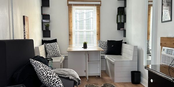 Amenities include: Full size bed converts to couch, TV, Pac-Man machine, eating table